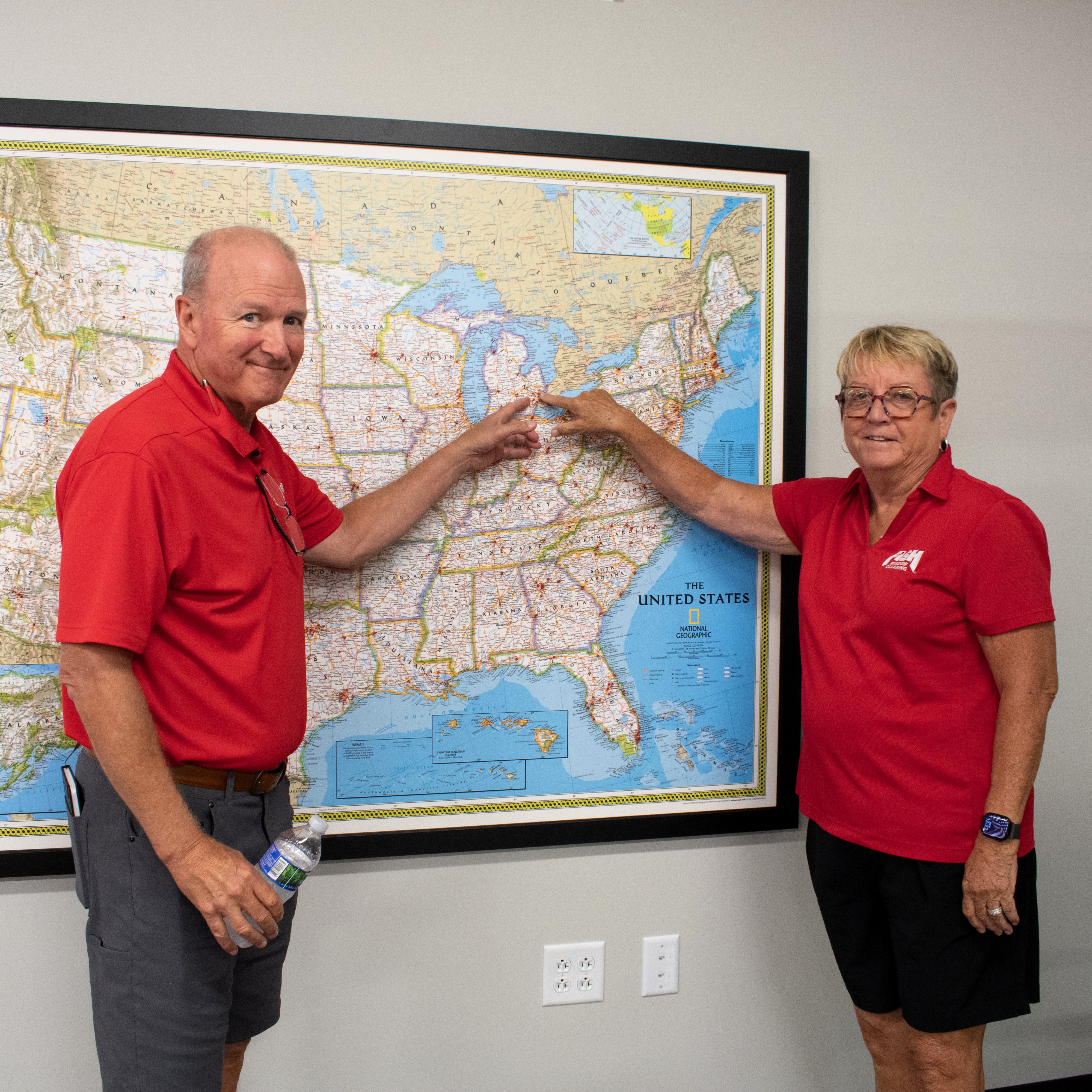 owners joe and bridget lang standing in front of red fish window cleaning truck