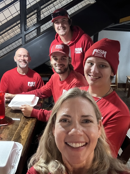 - Wear red Fish Window Cleaning uniforms for easy identification